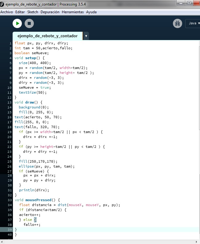 Para generar el rebote de la ellipse en la ventana se utilizó una variable booleana y condicionales(if) para implementar los límites de la pantalla. También se usaron variables numéricas junto con if y else para aumentar los valores del contador.