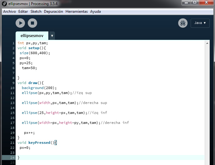 En este ejercicio se utilizaron variables y cada ellipse avanza en dirección horizontal o vertical de izquierda a derecha o viceversa.