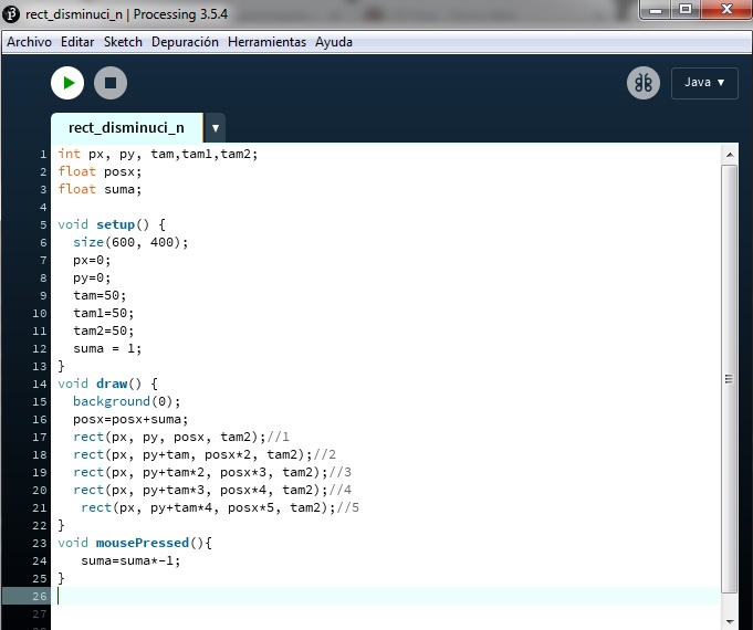 En este ejercicio se pueden ver rectángulos que avanzan independientemente o retroceden si el mouse es presionado. Se utilizaron variables de tipo float para el movimiento en la posición x.