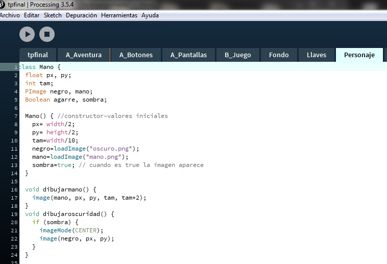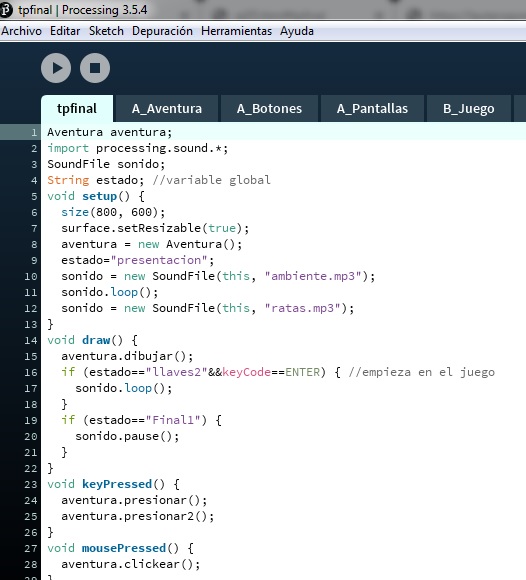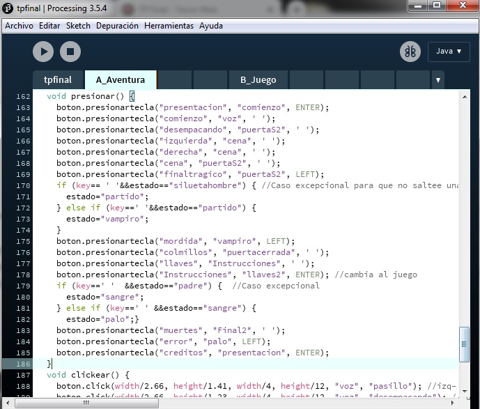 En la clase principal, llamada aventura, se declararon las clases de los botones y las imágenes para usar las funciones con parámetros, y el juego para vincular con condicionales su posición dentro de la aventura y detectar el movimiento de la mano para agarrar las llaves. También se usó arreglos para cargar todos los textos y más funciones con parámetros en métodos cargados en el programa principal dentro de los eventos.