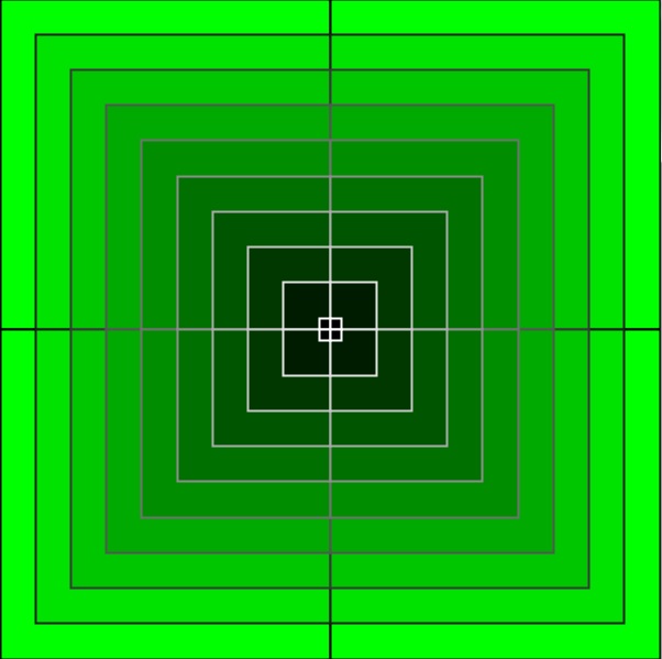 Realizado con un solo ciclo for de 10 repeticiones que ejecutan 4 funciones rect() y adaptan su posición y su tamaño mediante map().